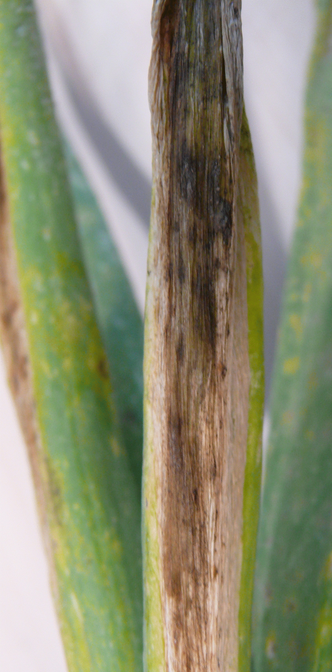 Stemphylium leaf blight is a foliar disease of onions and garlic caused by the fungus Stemphylium vesicarium. Symptoms start as small yellow to tan, water-soaked lesions that develop into elongated spots that turn dark olive brown to black when spores develop. Leaves may be completely blighted as the lesions coalesce (Fig. 1 and 2). The symptoms of stemphylium leaf blight are easily confused with purple blotch, which is caused by Alternaria porri (Fig. 3). These foliar diseases of onions can prematurely defoliate the crop which can compromise bulb quality and make the crop more susceptible to secondary diseases that affect bulb quality (i.e. storage rots caused by bacterial pathogens).