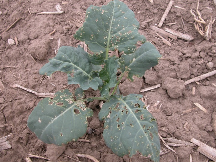Flea beetles are a common crop pest of crucifers in Ontario and overwinter as adults near the soil surface in debris and stubble from the previous crop. They typically become active with the first extended period of warm weather in the early spring as the leaf litter begins to thaw. The beetles feed on weeds throughout the field and have the ability to fly on calm days and will attack brassica seedlings as they emerge or transplants as they are planted.