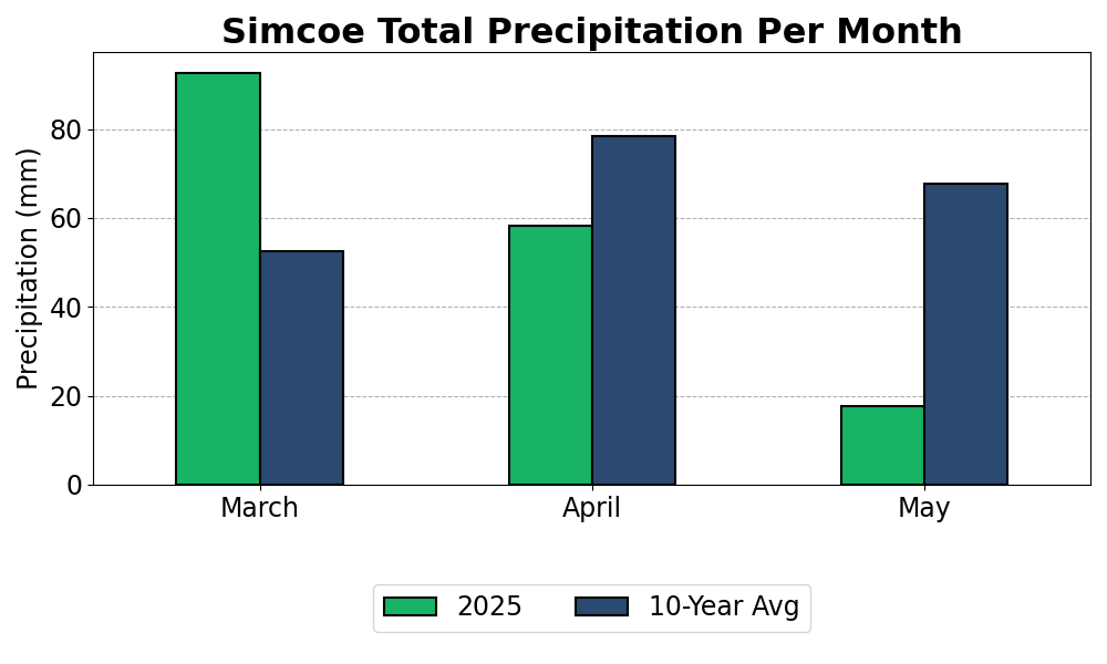 Excluding the northern counties of Sudbury, Thunder Bay, and Timiskaming, all counties are currently trending above their 10 year average GDD. Almost all counties, excluding Essex, have also had a relatively dry May so far.